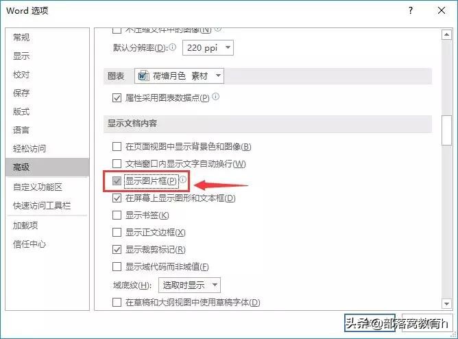 点击【文件】-【选项】命令,打开“Word选项”对话框,选择“高级”选项卡,在”显示文档内容“栏中勾选”显示图片框“复选框,单击”确定“按钮。