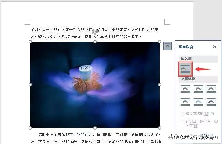 这是因为你当前文档中图片的环绕方式不是嵌入型。如何将图片设置为嵌入型呢?只需选择图片,点击右上角的”布局选项“按钮,在弹出的列表框中选择”嵌入型“选项即可。