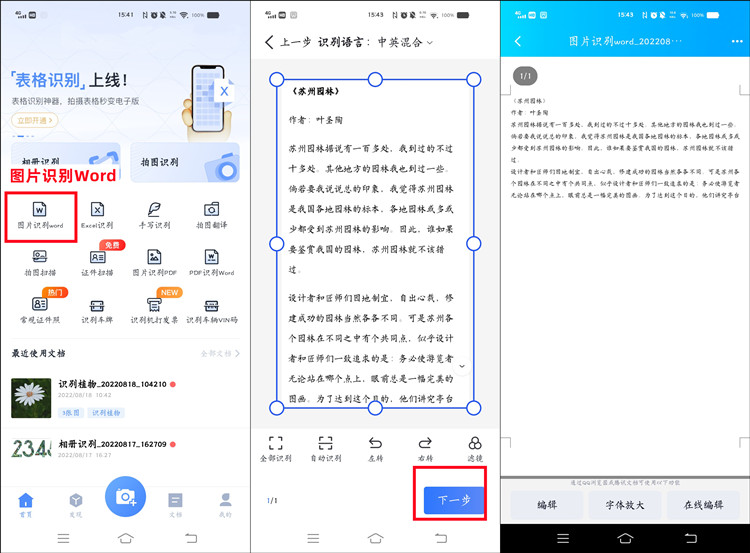 点击打开软件,我们看到软件的第一个功能就是【图片识别Word】,点击选择。接下来点击拍摄图片或者直接从相册导入图片,一次最多可以导入十张图片。点击【下一步】即可进行识别。我们点击分享文档到相应的位置,即可查看Word文档。(该软件会保存每次的使用记录,如果找不到文档了,打开软件就可以找到)