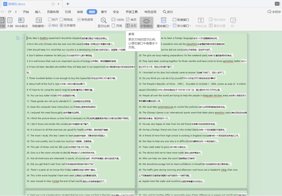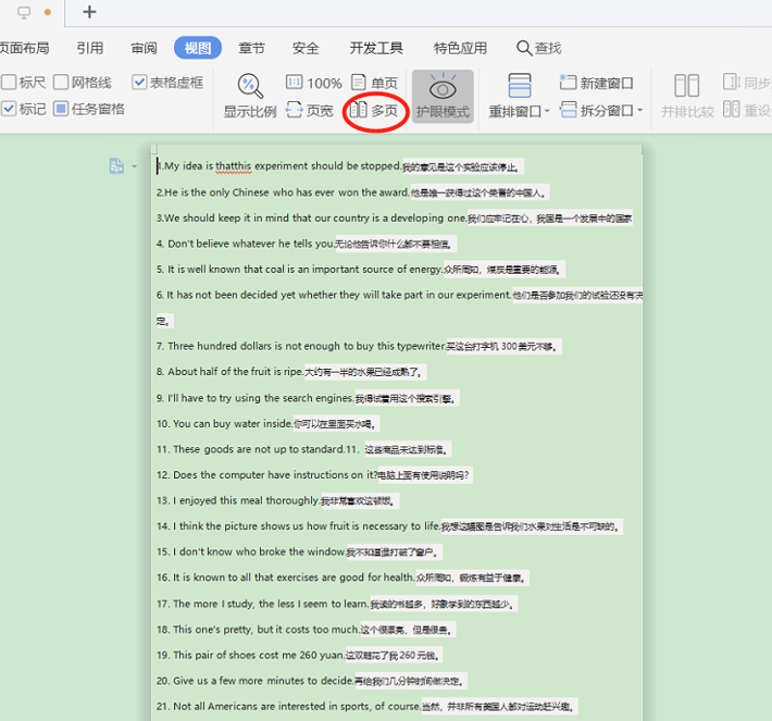 点击“多页”后,会发现文档默认的是双页显示,方框处可以看到文档从单页显示变为了双页显示,显示效果如下: