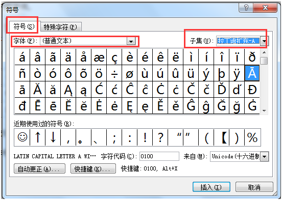 步骤2、在弹出的[符号]对话框中,在[符号]选项,字体选择[普通文本],字集选择[拉丁语扩充-A],即可以看到各种声调。
