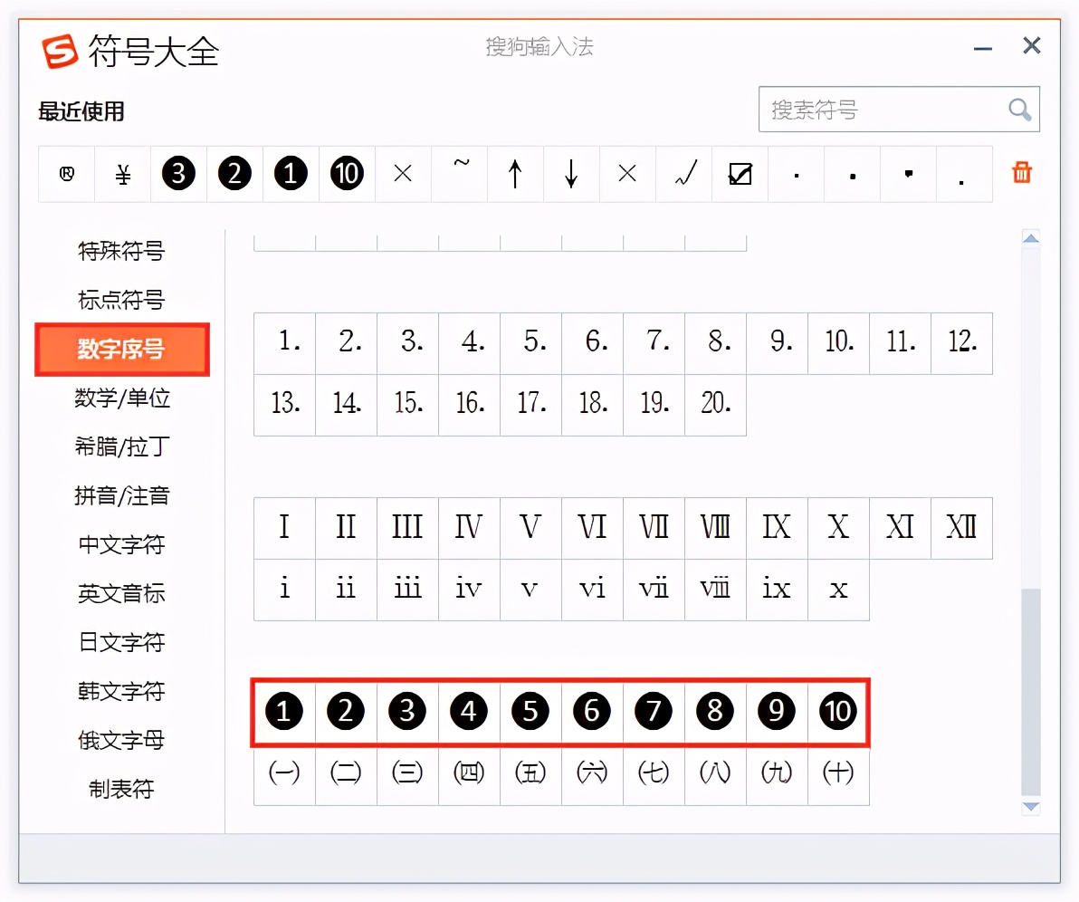 3.在弹出的“符号大全”窗口中,单击左侧列表中的“数字序号”,在右侧向下滑动鼠标找到黑底白字的数字序号,单击想要的数字序号即可在文档相应位置插入。