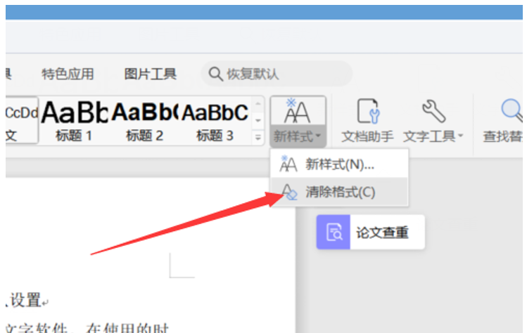 在子菜单中我们点击新样式,然后点击下拉列表中的清除格式,这样所有的文档格式就被消除了: