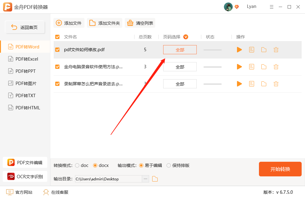 三、软件支持自定义页面进行转换,点击“全部”选择即可;
