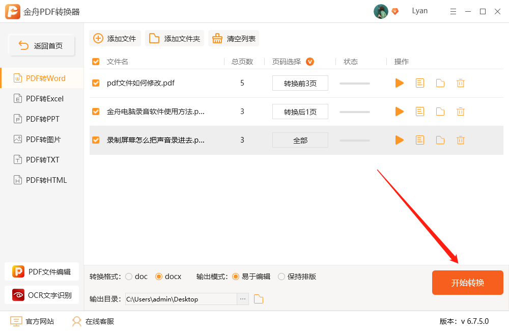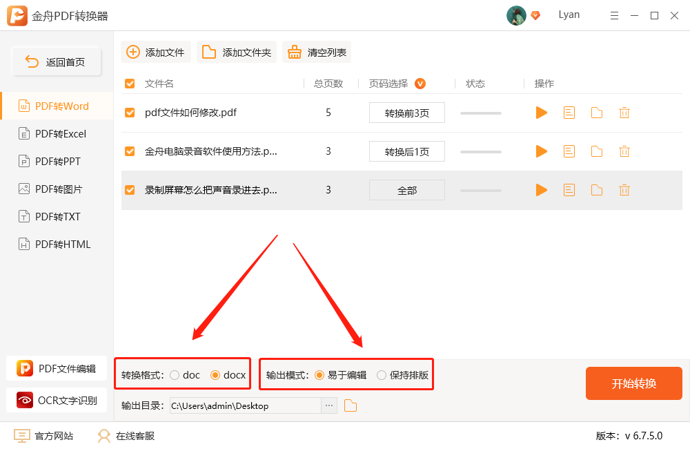 五、转换格式的类型也可以选择,例如word的doc和docx格式,输出模式可以选择易于编辑或者保持排版;