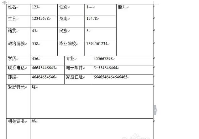 5、调整表格的格间距,(用左键点击表格边框拉伸)并将多余部分合并单元格(选中要合并的单元格,点击鼠标右键---合并单元格)至如图效果 把所有填充文字都合理展示。