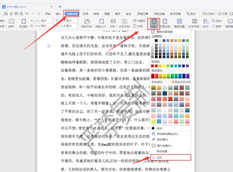 第二步,依次点击菜单栏中的【页面布局】-【背景】-【水印】: