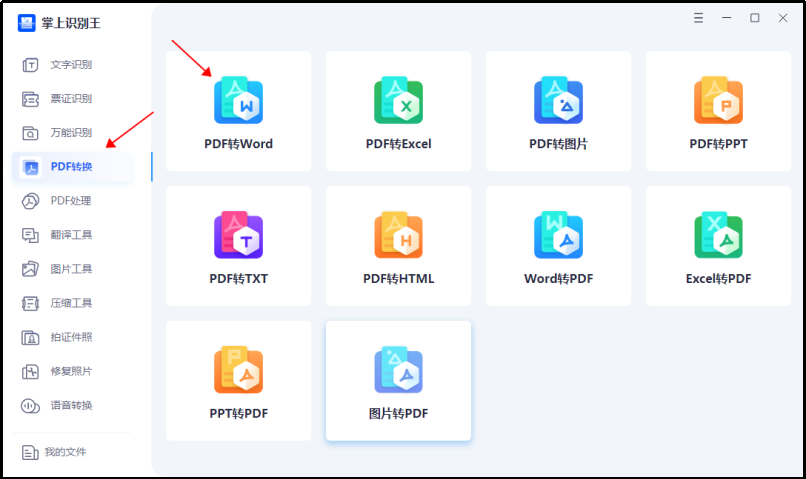 第一步:首先打开【掌上识别王】,找到【PDF转换】功能,然后点击.,可以看到,这里一共有是十种转换功能,我们点击第一种【PDF转Word】。