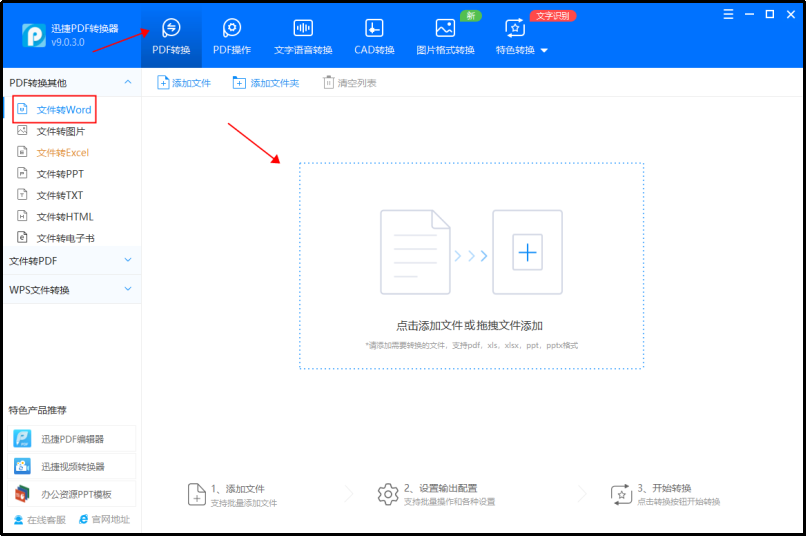 第一步:打开这款转换器,在上方的工具栏中找到【PDF转换】,点击左侧的【文件转Word】。接着我们将需要转换的文件添加到指定区域,可以通过点击或者拖拽的方式添加。