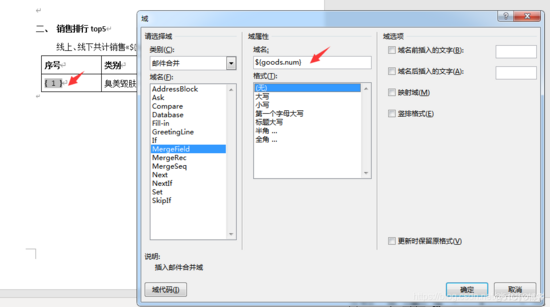 2. 在弹出的对话框中,类别选择“邮件合并”,域名选择 "MergeField",域属性中的域名填入模版表达式${goods.num},点击【确定】按钮;