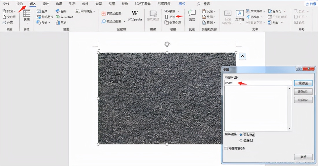 1. 在Word模版中需要插入图片的位置插入一张模版图片,然后鼠标单击模板图片插入一个书签,设置书签名称,比如chart,最后点击【添加】按钮: