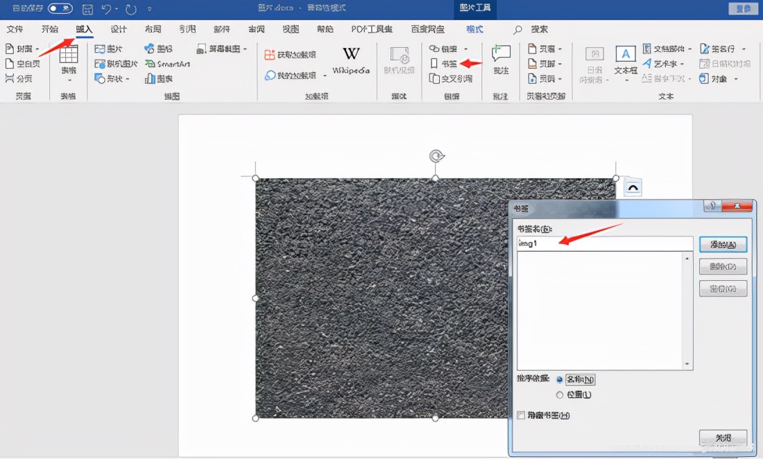1. 在Word模版中需要插入图片的位置插入一张模版图片,然后鼠标单击模板图片插入一个书签,设置书签名称,比如img1, 最后点击【添加】按钮: