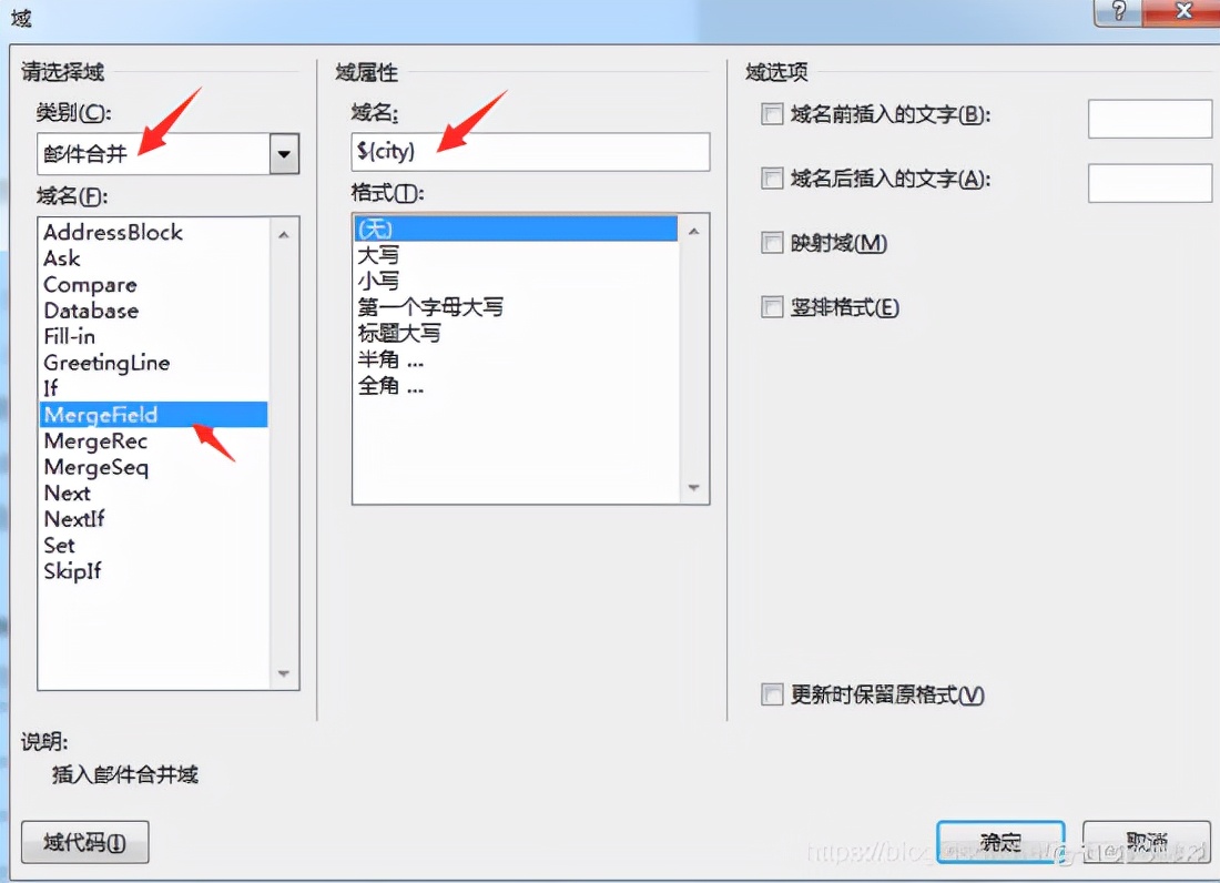 2.在弹出的对话框中,类别选择“邮件合并”,域名选择 "MergeField",域属性中的域名填入模版表达式${city},点击【确定】按钮: