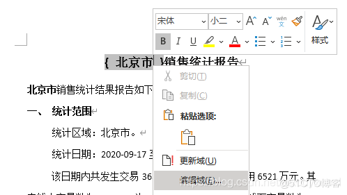 1.首先在Word模板中选中要替换的文本,在这儿拿标题中的"北京市"为例,然后键盘使用 Ctrl + F9 组合键将其设置为域,此时文本会被"{}"包围,接着鼠标右键选择【编辑域(E)...】: