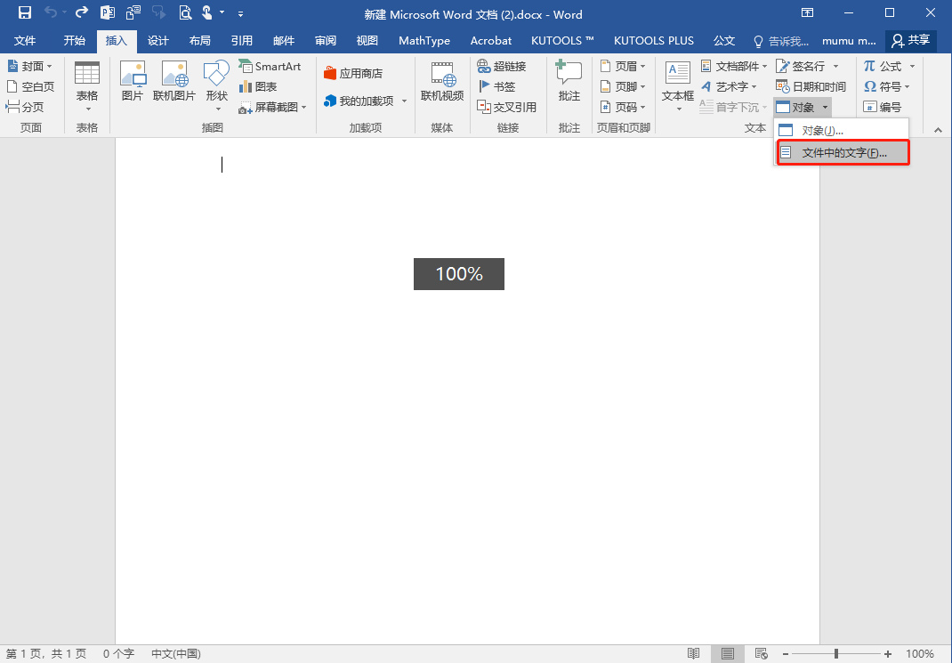 新建一个空白的Word文档,选择【插入】——【对象】——【文件中的文字】功能选项。