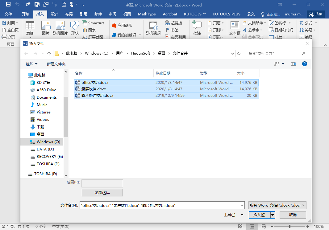 然后找到我们刚新建好的文件夹,选中全部文档,再直接插入就可以了!