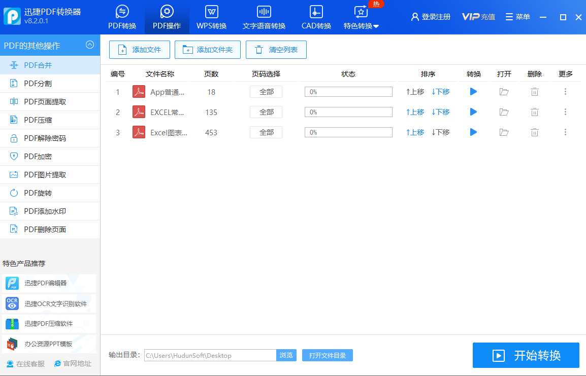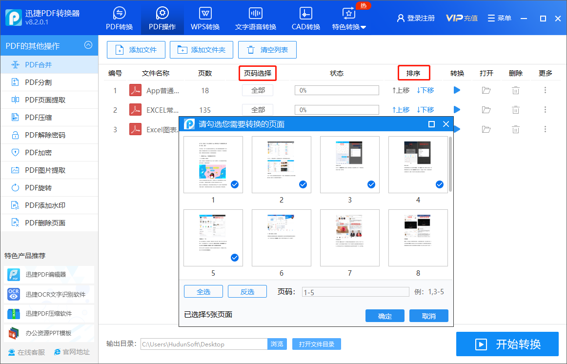 添加文件后,可以点击【页码选择】选择需要合并的部分,或调整文件顺序,完成后,点击右下角的【开始转换】按钮,等待转换完成后就可以查看效果了~