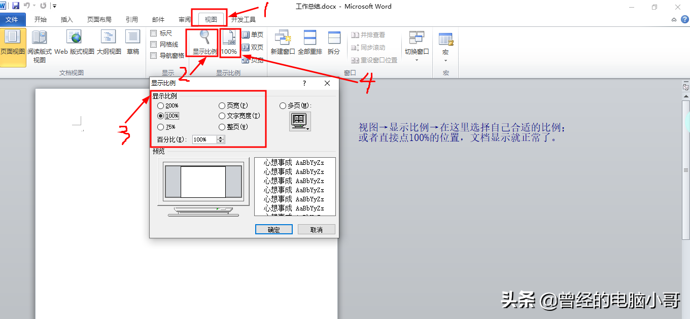 找到word文档视图选项→点击显示比例→选择100%→确定或者直接点击右边的100%即可恢复正常。