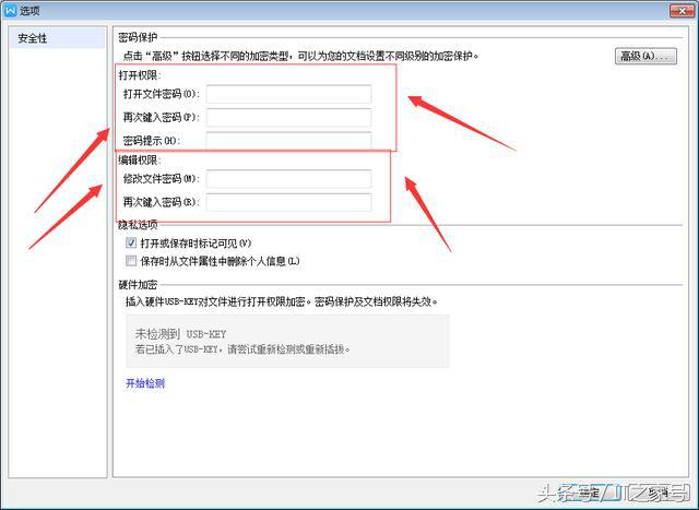 第三步,弹出选项对话框,我们可以在这里设置,文件打开时的密码,还可以设置,对文件进行编辑时输入密码。设置好以后,单击确定按钮,