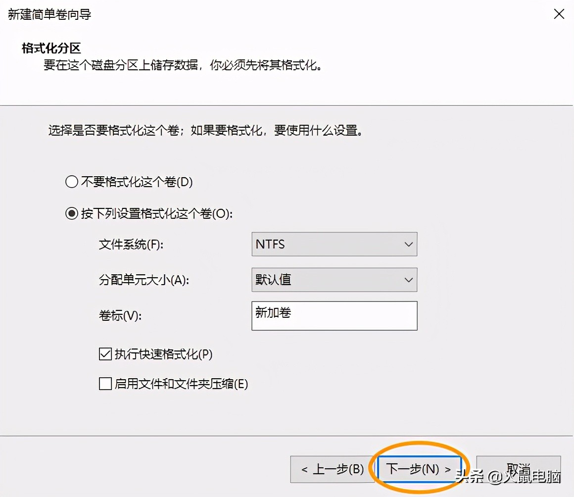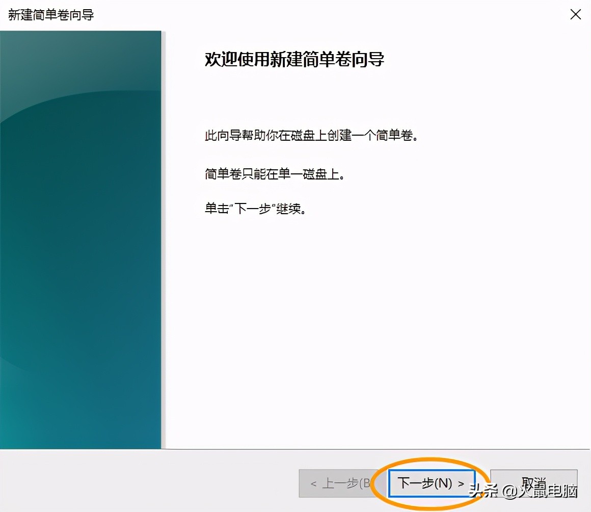 5.选择刚刚压缩出来的 未分配 磁盘空间 -> 鼠标右键 -> 新建简单卷 。新建简单卷向导,点 下一步