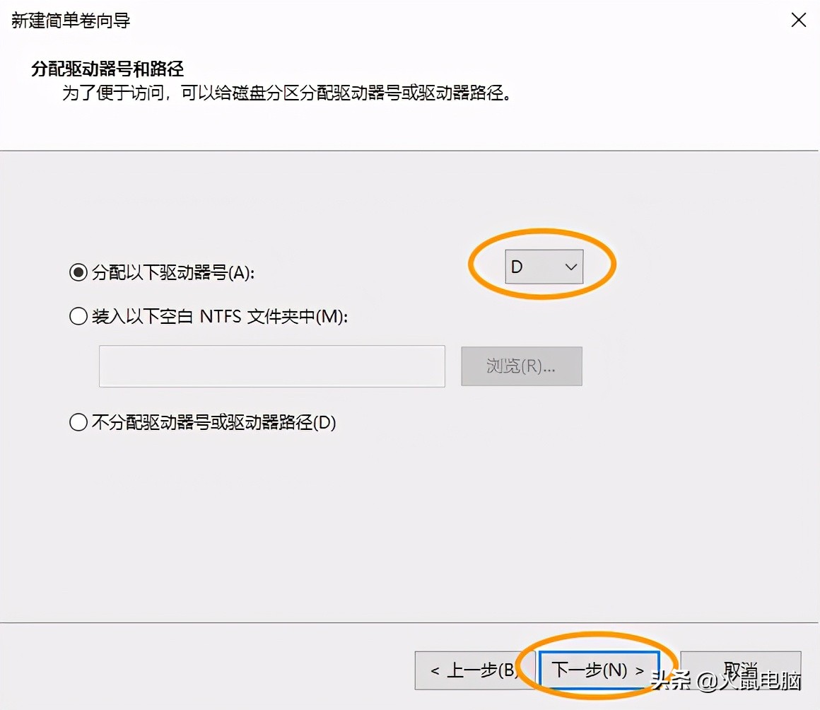 7.分配以下驱动器号:选择 D 或者 E,然后点 下一步