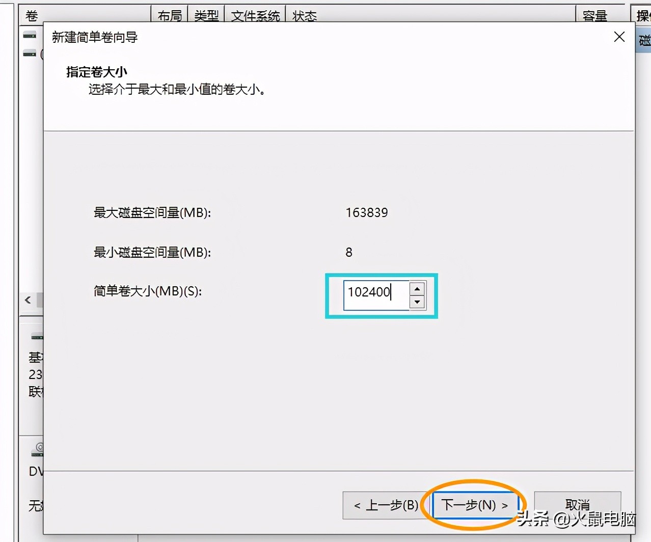 6.分配大小,只想建立一个就默认全部大小。想创建更多就输入指定大小,这里输入102400=100GB,然后点 下一步
