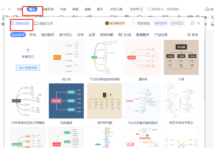 1、打开Word文档,在菜单栏中选择【插入-思维导图】按钮;