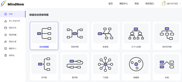 2、点击新建-思维导图,选择需要的思维导图结构,如【向右逻辑图】开始绘图;