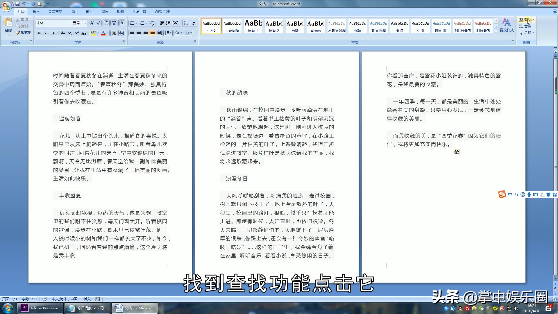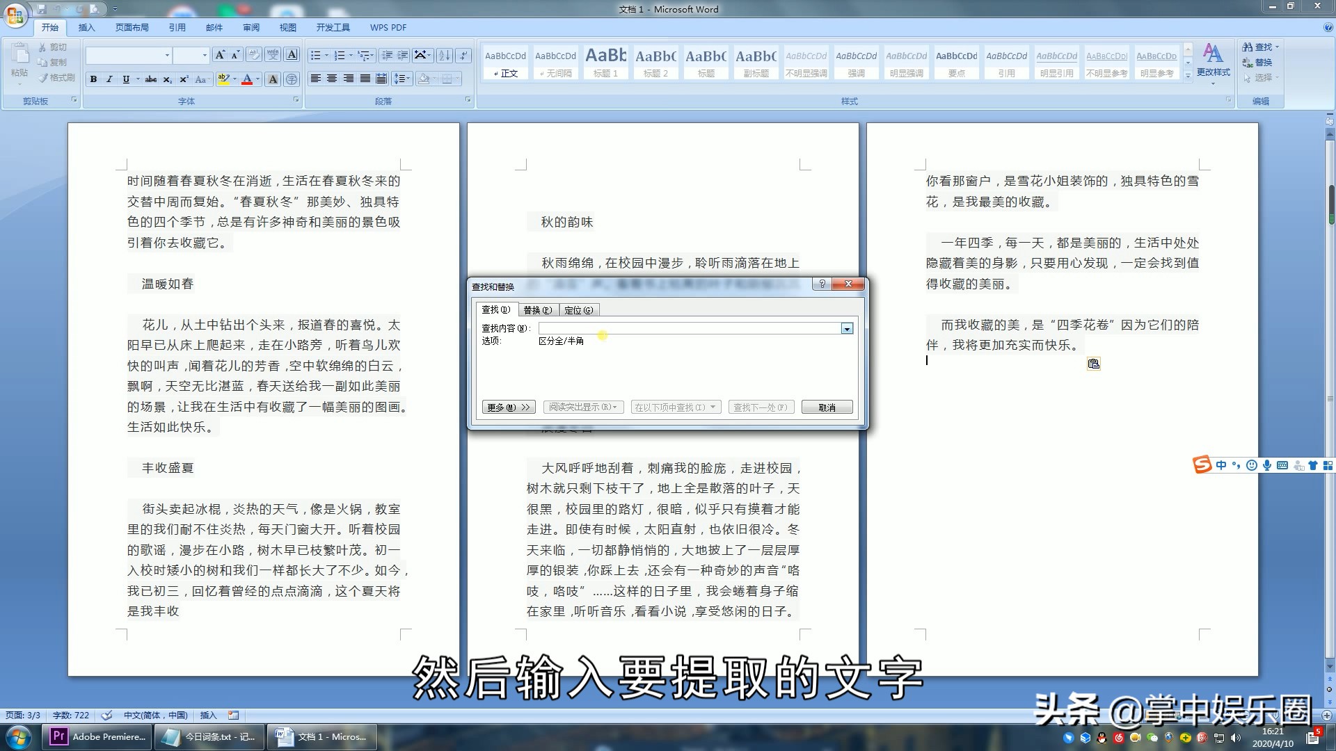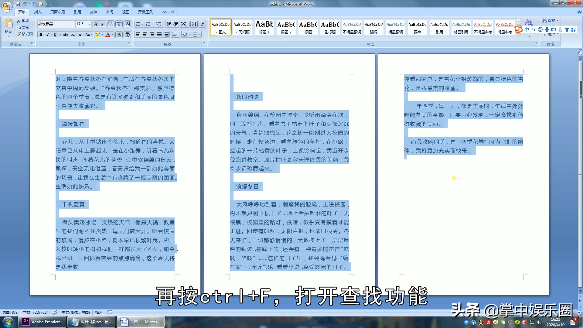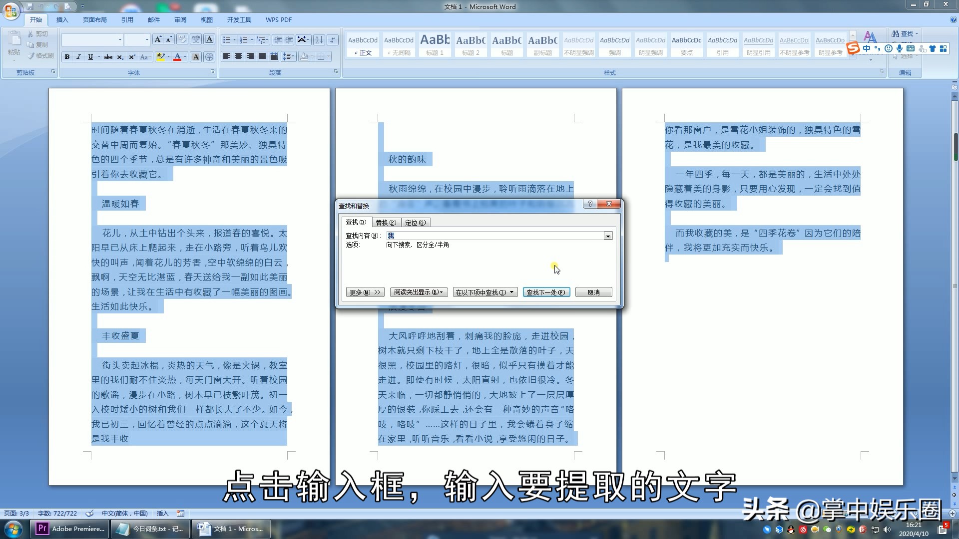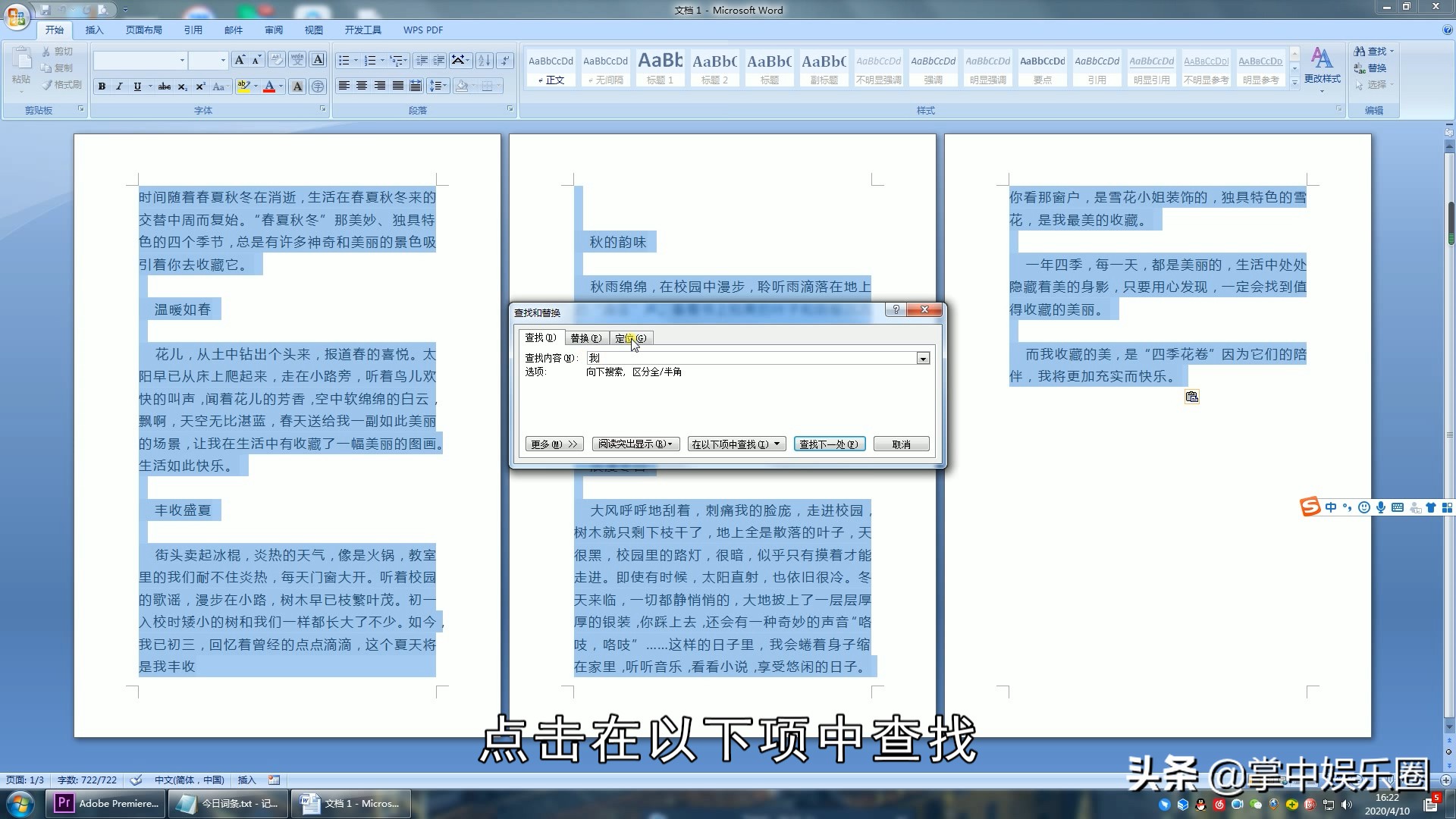 1.打开word文档,ctrl+A全选所有文字|||2.打开查找功能,输入查找文字|||3.点击在以下项中查找,选择所选内容|||4.点击开始,打开查找功能|||5.输入查找文字,点击全文档查找|||6.ctrl+A全选所有文字,按ctrl+H打开替换功能|||7.点击查找,输入要查找的文字|||8.点击在以下项中查找,选择当前所选内容