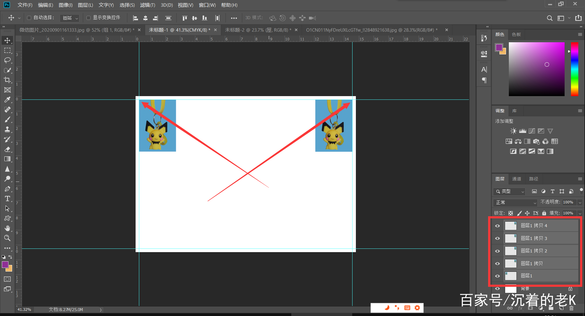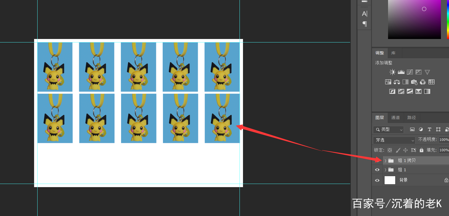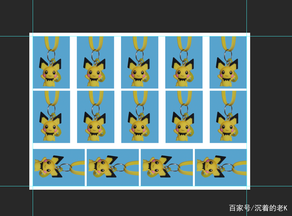 再复制一张1寸照片,按ctrl+T将其旋转90度拖到下方以左下角参考线对齐,再按住Alt用鼠标左键向右复制三张,有一张以右下角的参考线对齐,再选中下方的四张照片点上方选项栏的水平分布按钮