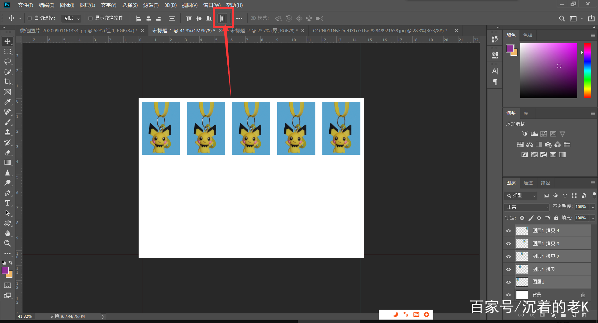点击上方选项栏的水平分布按钮将5张照片下平均水平分布,
