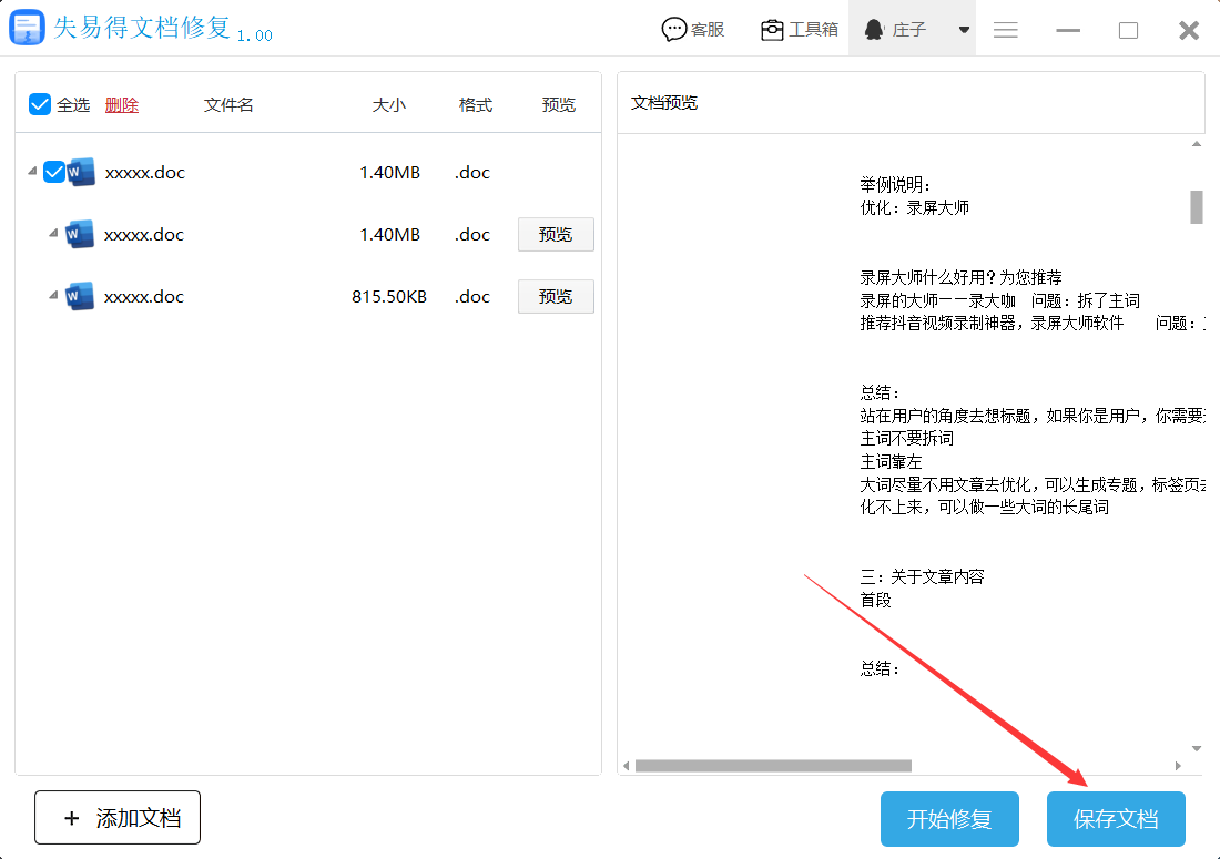 第四步:预览完成后,就可以点击“保存文档”自定义保存路径了。