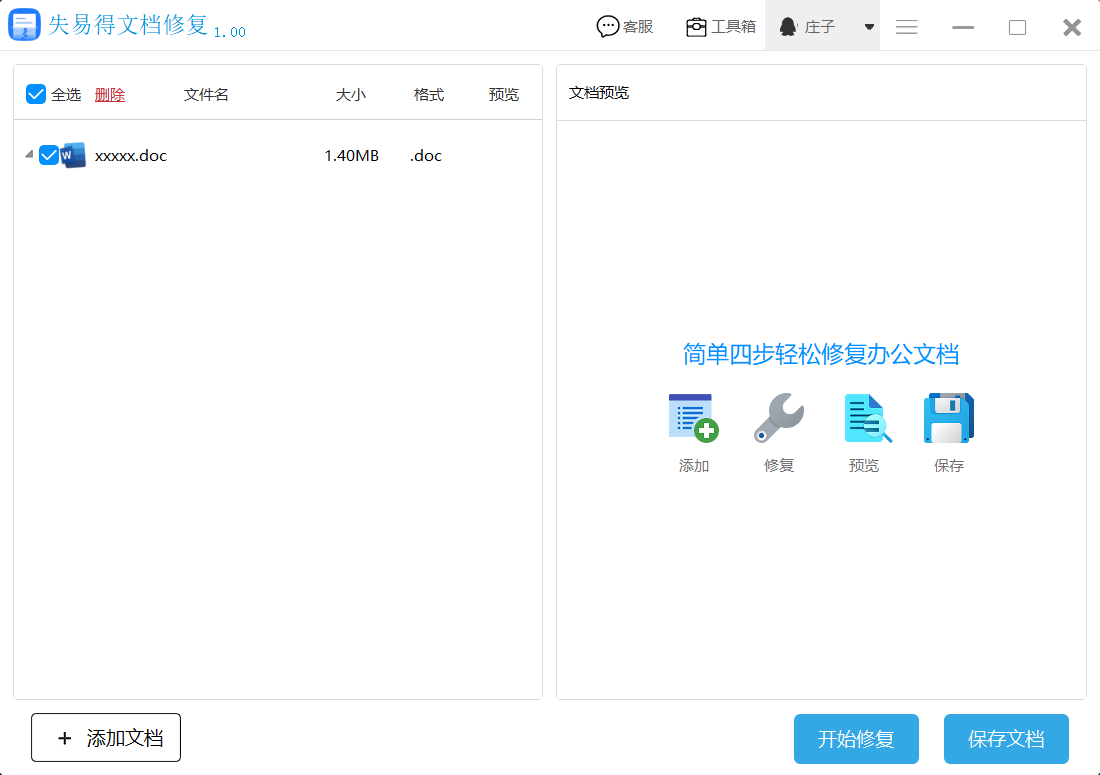 第一步:打开失易得文档修复软件,点击“添加文档”选好要修复的文件。