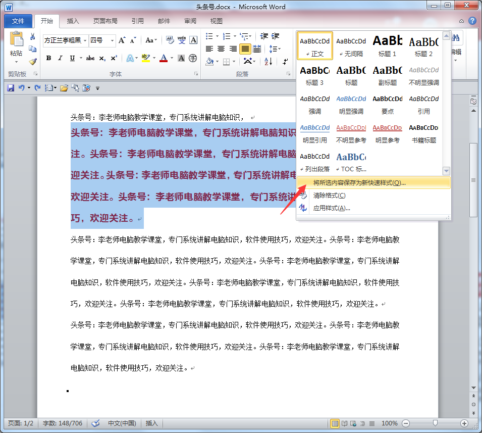 如图打开一篇WORD文档,选定一段文字,设定好样式,包括字体,大小,颜色,行距,字距等等,然后在样式中点击 将所选内容保存为新的快速样式: