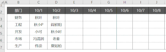 左边看部门、右边看日期,在交叉的位置,填写上值班人员的名字就可以了。