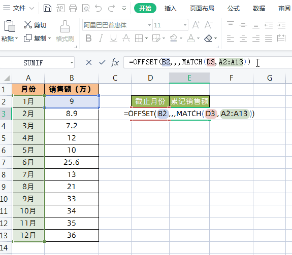 3、最后通过SUM函数求和=SUM(OFFSET(B2,,,MATCH(D3,A2:A13)))