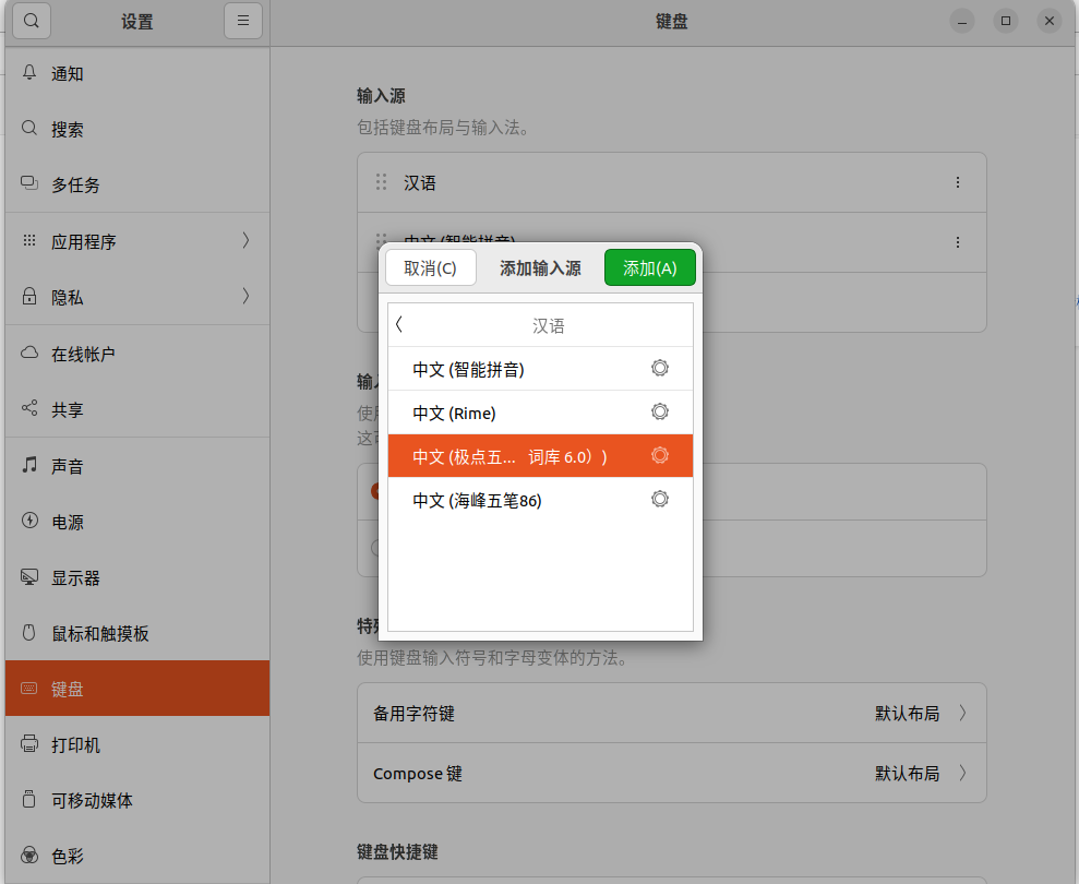 设置--》键盘--》增加输入源--》汉语--》增加相应输入法