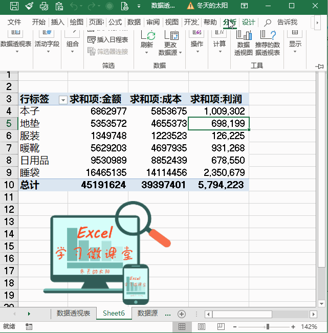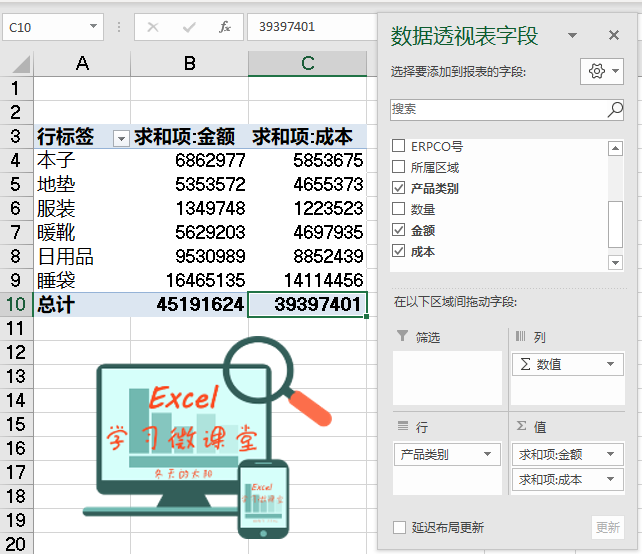 步骤1:创建数据透视表,将产品类别放在行字段,将金额和成本放在值字段。