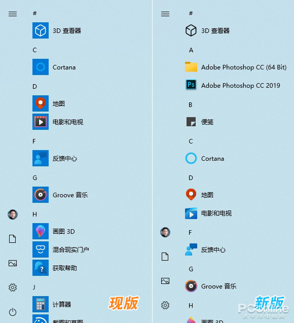 除了磁贴底色以外,程序列表的底色也被一并取消。整体看上去更加协调,特别是文件夹和第三方程序,视觉感要比现版好上很多。