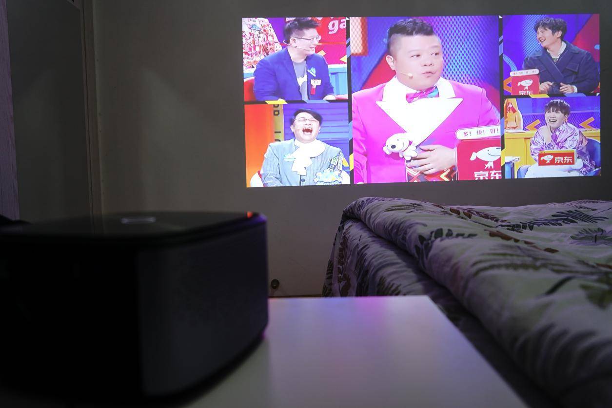 实际体验中,得益于3200流明的光源亮度,不管是在白天光线亮度较强的情况下,还是在晚上高亮度都是可以有着非常清晰的表现。如下图是白天光线最强的时候,在空旷的客厅使用坚果J7智能投影,画面投影到白墙上,但是亮度、清晰度依然有保障。如果是家中拉上窗帘或者防御房间内使用,亮度、清晰度将会更高。