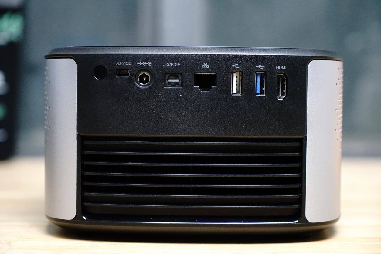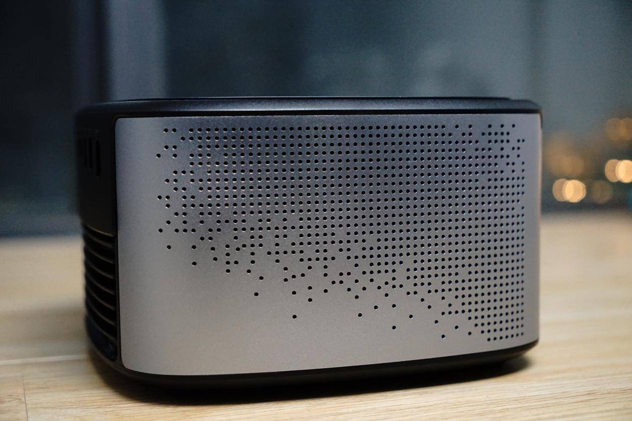 机身左右两侧均有密集且富有设计感的开孔,这主要是用户提升两侧的进风量,加快投影仪的散热,同时也对于360°全立体音效也是有所增益的,个人觉得其开孔的布局也是比较有设计语言。