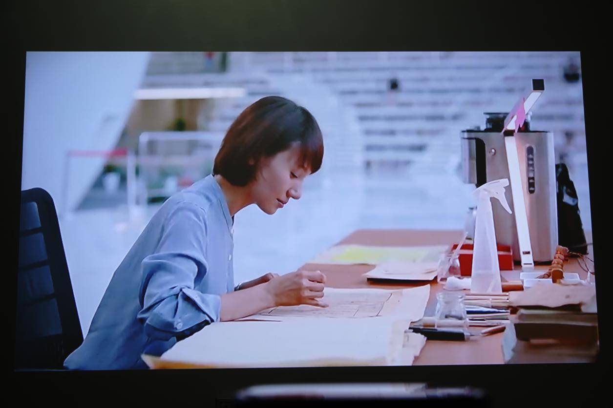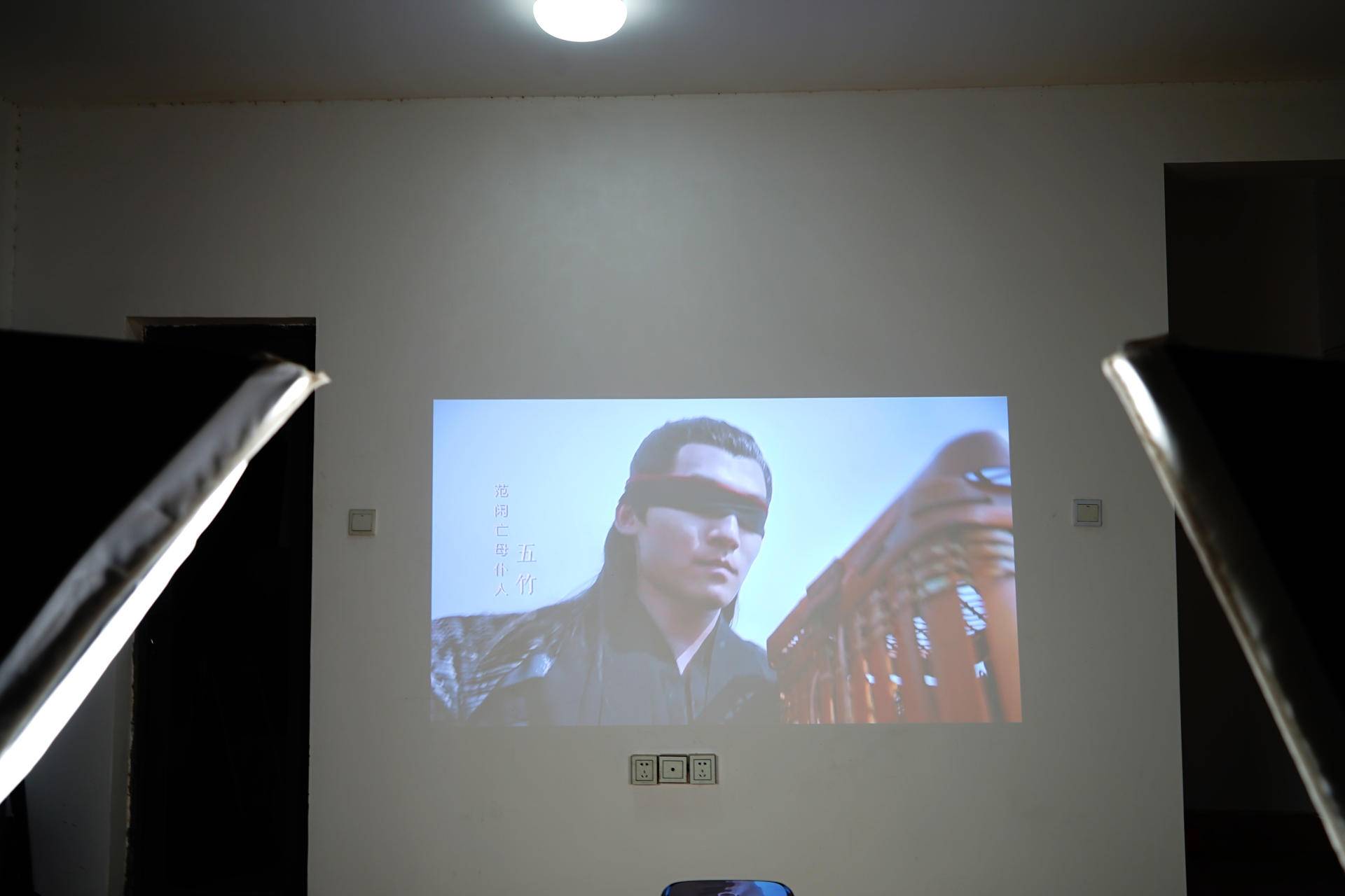 而正常在家看电影、电视是会开着灯的,我们为了更好地测试其在夜间强光下的表现,特意加了两盏影棚用的灯,提高环境光亮度,经过实际体验会发现,即便是在晚上极限强光情况下,我们也可以看到比白天还要清晰的画质。