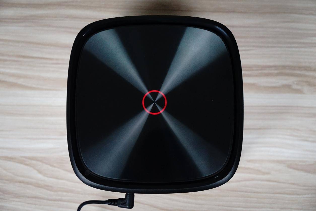 再看到机身的顶部,为锖色金属光泽的顶盖,随着光影可以看到纹理的变换而不同,更显高端,其中间有一个若隐若现的圆环,为信号灯环,中间为触控式开关,待机状态为“红色”,开机状态为“白色”。机身底部则为产品的一些基本信息,最中间为支架连接口,四个角上为防滑脚垫。