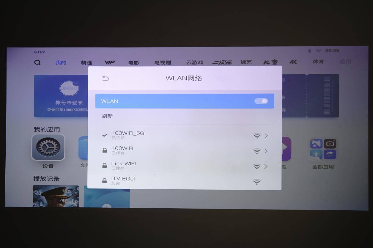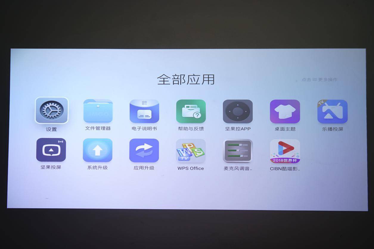 打开设置界面,还有会拥有更多的内容,而用户开机后首先需要做的就是连接WiFi,坚果J7智能投影支持双频WiFi,需要更稳定更快网速的体验,用户就可以选择连接5GHz频率的WiFi。除了WiFi连接外,用户还可以进行蓝牙连接,将手机和投影仪连接,手机上下载着一个“坚果控”即可代替遥控器控制投影仪;坚果同屏则可以帮助用户,将手机上的视频投影到坚果J7智能投影上进行观看,比较方便;进入全部应用,除了乐播投屏APP、坚果投屏、酷喵影视等,还有WPS办公软件,适用于居家办公。