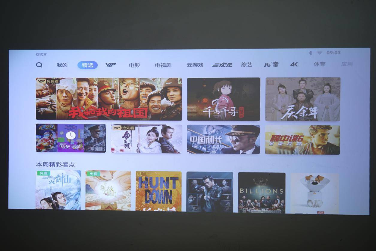 坚果J7智能投影开机后,即可看到系统的“精选内容”,基本上是最近热门的电影电视剧,整体的设计布局和大部分电视系统相似,大家操作起来也会很容易上手。坚果J7智能投影系统内容源自爱奇艺,而爱奇艺的内容的内容会比较多的,加上用户可以自己下载APP进行拓展内容,所以内容上大家不用担心。如果你家里有小孩,还有专门的“儿童”版块,家长也可以进行密码设置,进行版块开机自启动和关闭的设置。