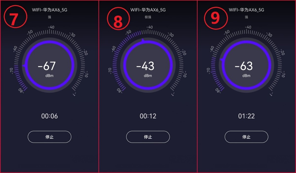 3和6位置点要穿过1堵承重墙,6位置点更远一些,信号都比较弱,信号值分别为-76和-71,手机到路由器的速率下降到了130M和78M。