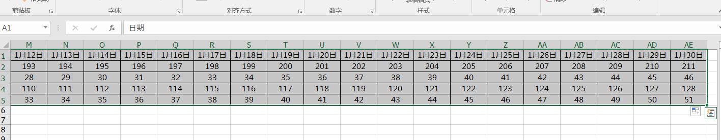 首先我们看一下我提前打好的横向表格,由于我比较懒所以随便复制了几行,别看数据,看技巧。这个表格很长,是一整月的业绩,要拉好久才可以看到30日就是最后一天的业绩,现在我们让这个表格从横向现实转换成竖向显示。
