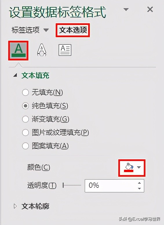 10. 选择“文本选项”-->“文本填充与轮廓”--> 将文本颜色设置为红色