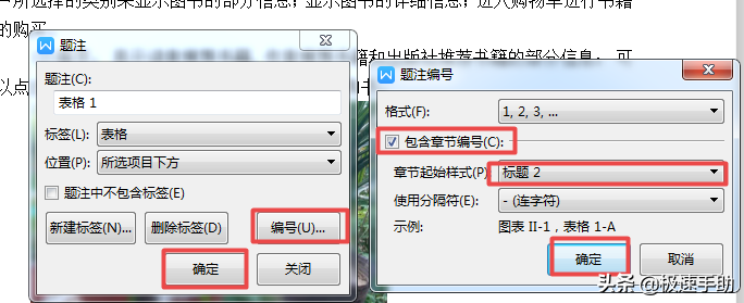 第五步,回到【题注】设置窗口中,点击【编号】按钮,再弹出【题注编号】设置窗口中,勾选【包含章节编号】选项,然后将【章节起始样式】的选项,选择为【标题2】,接着点击【确定】按钮。