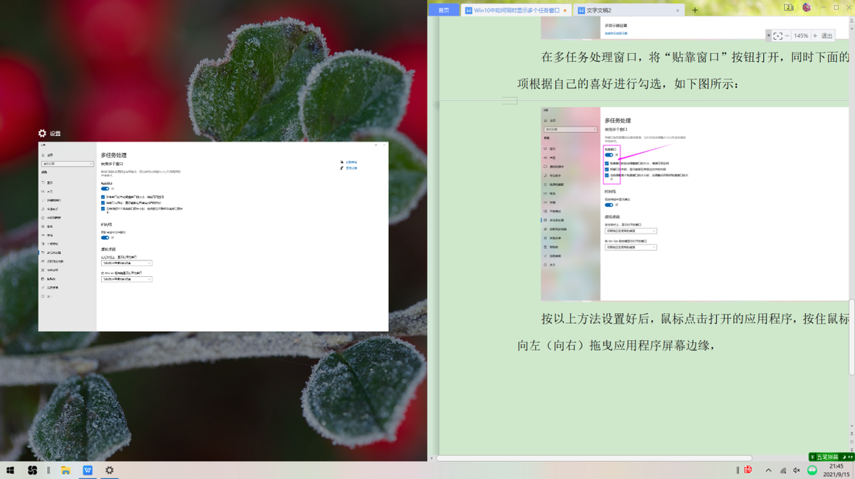 按以上方法设置好后,鼠标点击打开的应用程序,按住鼠标左键向左(向右)拖曳应用程序至屏幕边缘,当前拖动的应用程序就会靠边显示,如下图所示: